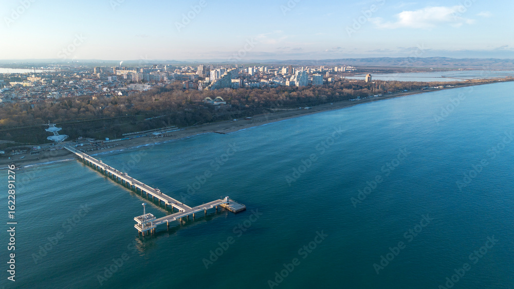 Burgas, Bulgaria - December 22, 2024: The view from the Burgas Bridge is filled with people admiring the view. It is the symbol of the city.