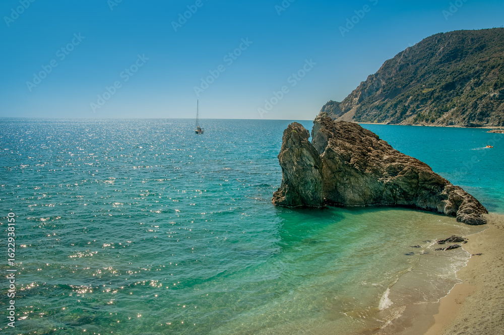 Top view of the sea stones on shore, turquoise Mediterranean Sea, Monterosso