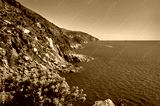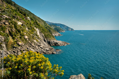 Vernazza in Cinque Terre over the turquoise water of the Mediterranean Sea and a yellow bush