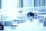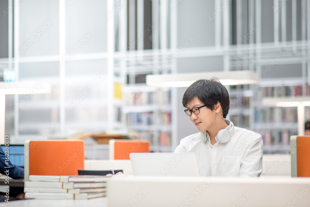 Young Asian university student working with laptop computer and notebook in library, self learning and college lifestyle concepts