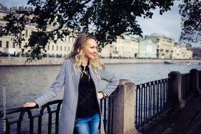 close-up portrait of a young girl hipster beautiful blonde with red lips laughing and posing against the backdrop of the city lifestyle