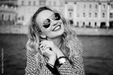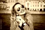 close-up portrait of a young girl hipster beautiful blonde in sunglasses with red lips laughing and posing against the backdrop of the city lifestyle
