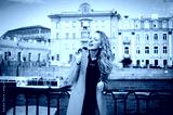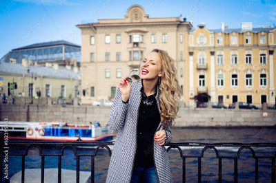 close-up portrait of a young girl hipster beautiful blonde in sunglasses with red lips laughing and posing against the backdrop of the city lifestyle