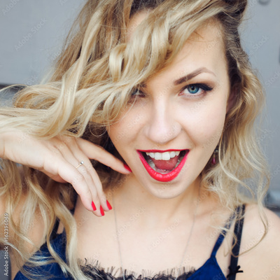 close-up portrait of a young girl hipster beautiful blonde with red lips laughing and posing against the backdrop of the city