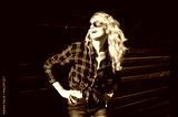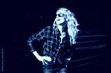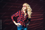portrait of a girl close-up of a beautiful young sexy blonde in a red plaid shirt and shorts denim in sunglasses smiling and posing on the Sunset hipster