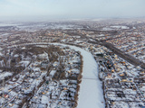 Aerial view of snow-covered houses near frozen river in Uralsk, Kazakhstan, during winter. c.