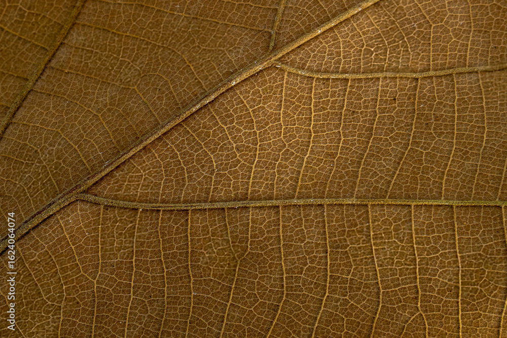 Macro shot of a dry brown leaf showing intricate vein patterns and natural texture, highlighting the delicate structure and organic design of foliage.