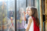 Two cute little sisters watching animals in the zoo on warm and sunny summer day