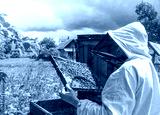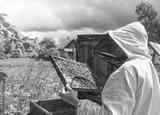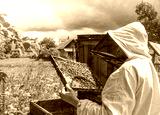 Beekeeper working with bees in beehive, showing the frame with honeycombs