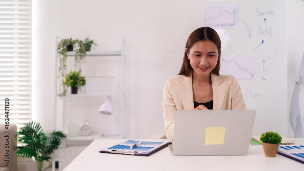 Asian adult businesswoman uses laptop for remote work analyzing financial data achieving profit growth at modern home office