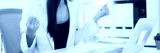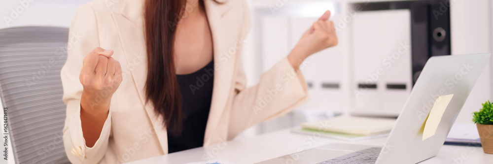 Adult Asian professional woman celebrates business triumph modern office desk achieving career goals empowered determination