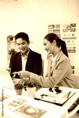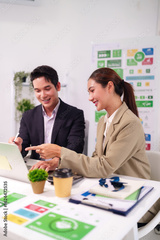 Asian adult professionals discuss ESG strategy analyze sustainable business data collaborate on corporate growth project in modern office setting