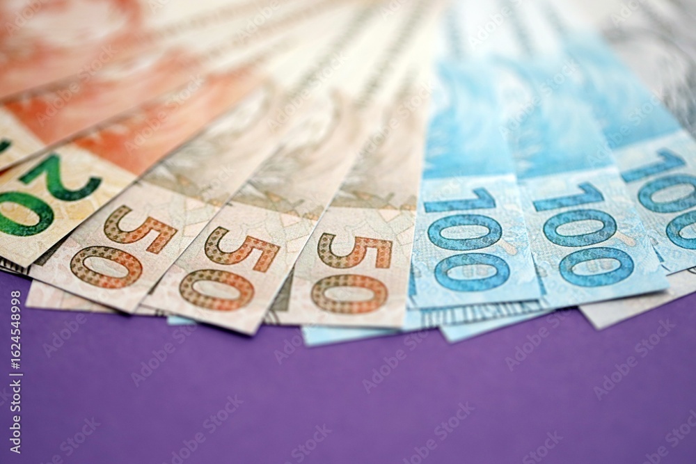 Close up of brazilian reais money bills in big amount on purple. Pile of Brazil real currency