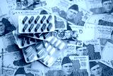 Pakistan rupees banknotes and medicine pills. Pakistan money bills with drugs close up