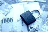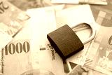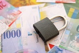 Swiss franc banknotes and padlock. The current francs money bills with lock lies in big amount