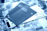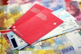 Swiss franc banknotes and passport with tickets. The current francs money bills and biometrical pass