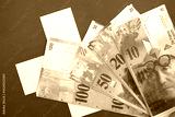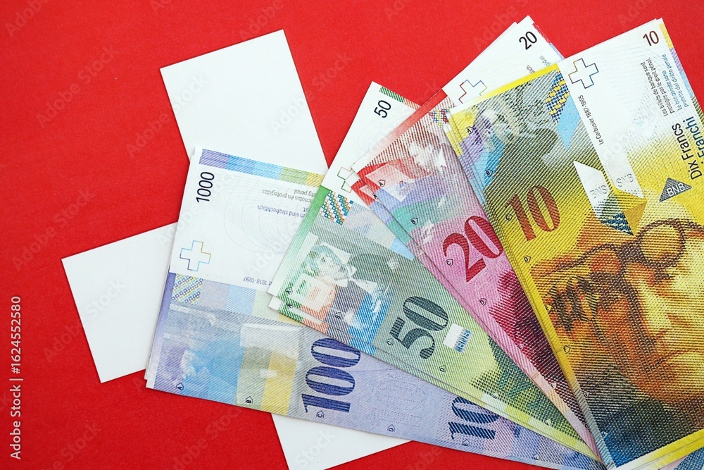 Swiss franc banknotes and flag. The current francs money bills lies on flag in big amount