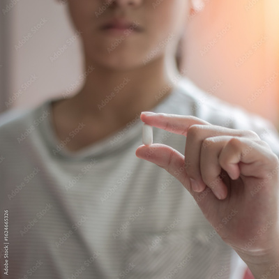 Teenager child girl, Asian youth kid having drug medicine tablet, taking medical pill for pain relief, antibiotic health care medication pharmacy healing from illness or sickness at home