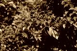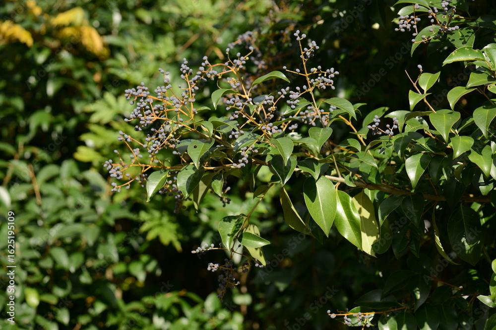 Ligustrum lucidum, or Glossy privet, with purple berries, shiny evergreen leaves, and white flowers used for liver health and immunity. Photographed in Korea.