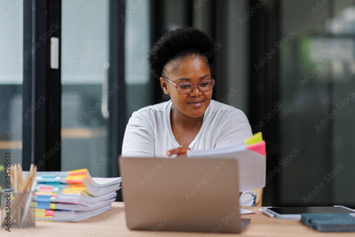 Business Documents, African American woman checking searching document for analysis TAX time,accountant Documents data contract partner deal in workplace office