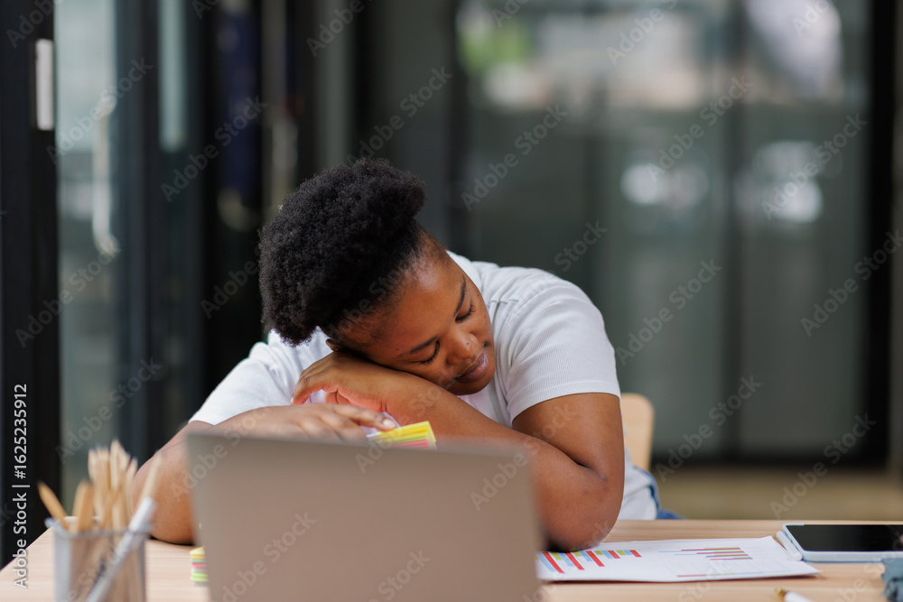 Tired burned out or sad,stress,boredom, African American woman with Afro hair on desk, exhausted by red tape paperwork piles, feeling stuck in this goddamn office. Burnout concept.