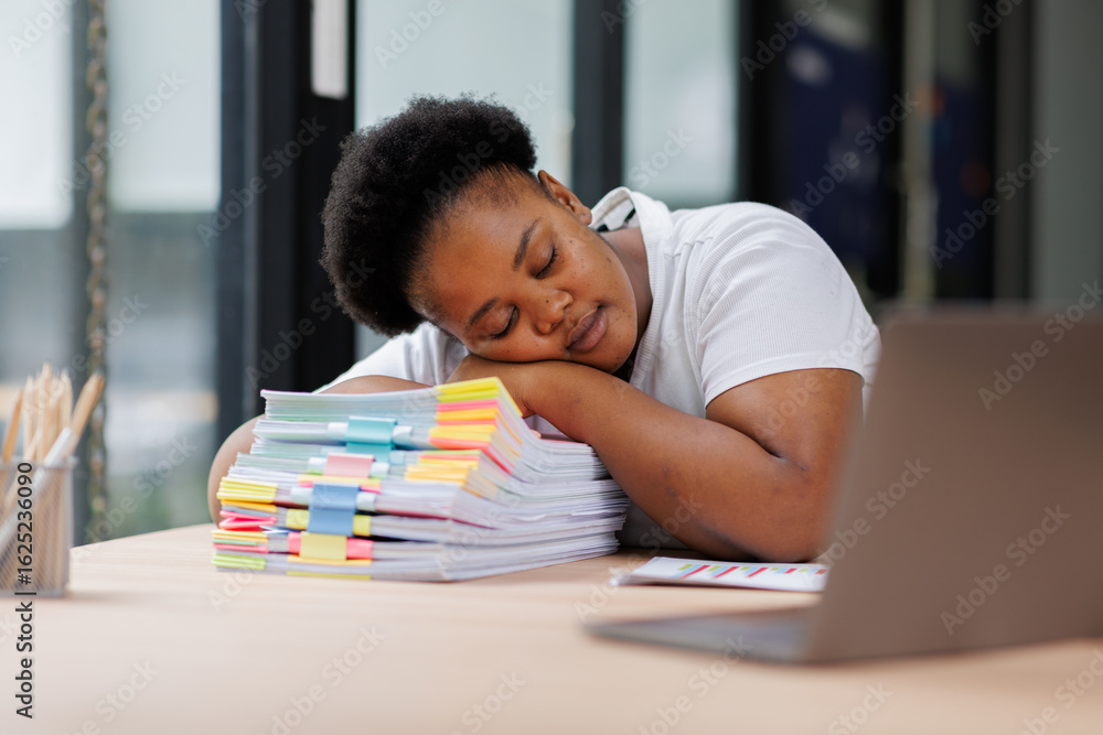 Tired burned out or sad,stress,boredom, African American woman with Afro hair on desk, exhausted by red tape paperwork piles, feeling stuck in this goddamn office. Burnout concept.