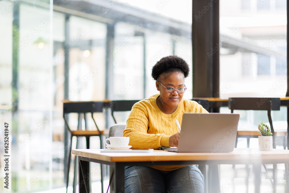 Thinking about how to take the business to technological heights. Bearded smiling attractive African American Caucasian freelancer sitting in cafe, drinking fresh coffee and using lapotp.