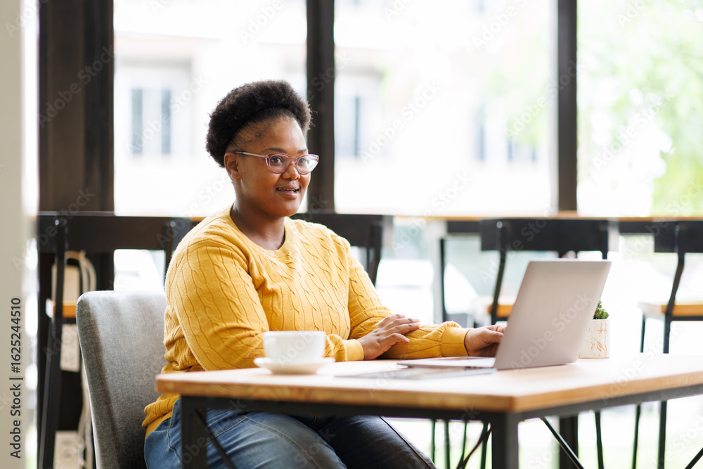 Happy African American Businesswoman Using Laptop At Workplace Modern Office. Copy Space