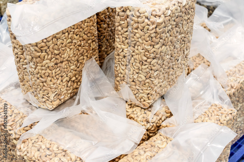 large plastic vacuum packs of wholesale cashew nuts in warehouse