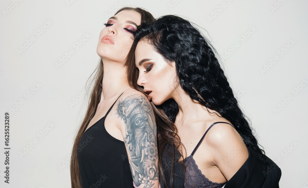 Sensual kiss between two beautiful women. Lesbian couple kissing. Lesbian couple with passion and desire. Two girls kissing with love. Sexy girlfriends kissing. Sexy models in love. Sensual kiss.