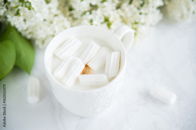 Cup of cappuccino with marshmallows white lilac
