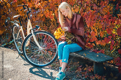 Autumn woman in golden sunlight. Autumn portrait of stylish girl with leaves. Autumn woman face in autumn park. Female model by falling foliage. Young woman walking through yellow leaves.