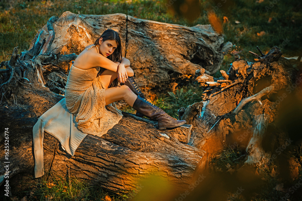 Autumn girl with leaves of maple trees posing outdoor. Dreamy girl in fall. Beauty model, young beautiful woman hold autumn leaves. Romantic woman in autumn park. Autumn fall concept.