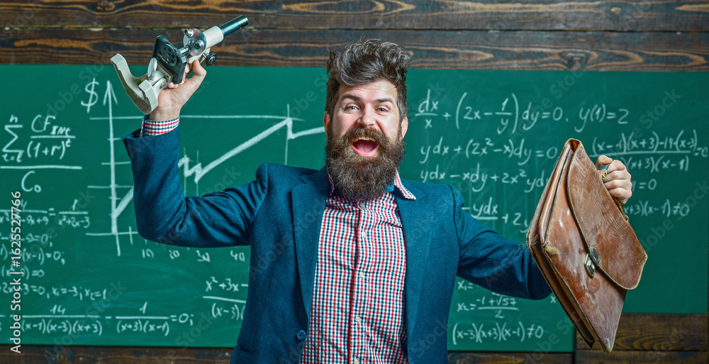 Teacher explains math. Professor in classroom on math lesson. School teacher near formula. Funny teacher. Professor teaching lesson. Teacher explains math. Teachers day. Knowledge and education.