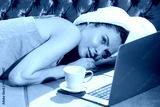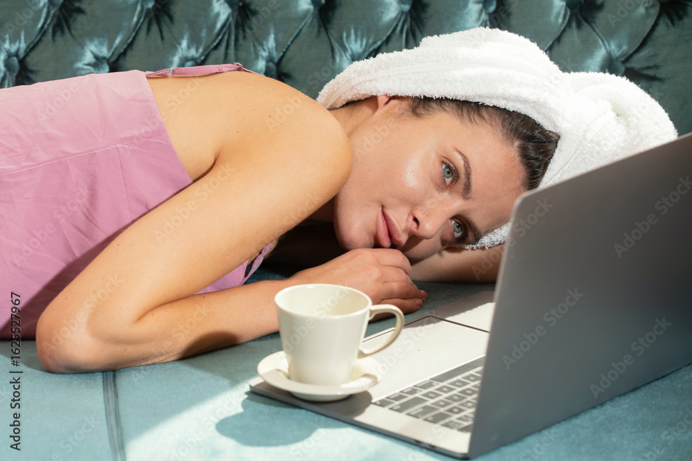 Woman daydreamer with laptop and coffee in pajama enjoying morning time at home. Woman relaxing with laptop at morning. Lazy morning. Girl laying on bed and using laptop in morning apartment.