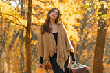 Autumn Woman Portrait In Fall Yellow Leaves, Pretty Girl in Autumn Park Outdoor. October Season. Woman Fashion Model with Fall Maple Leaf Outdoors. Autumn Romantic Girl in Autumnal Mood.
