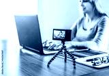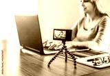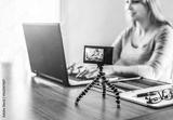 Woman vlogger looking using laptop computer and filming on video her life - New job trends concept - Girl sharing on internet social networks lifestyle contents - Focus on tripod camera - Warm filter