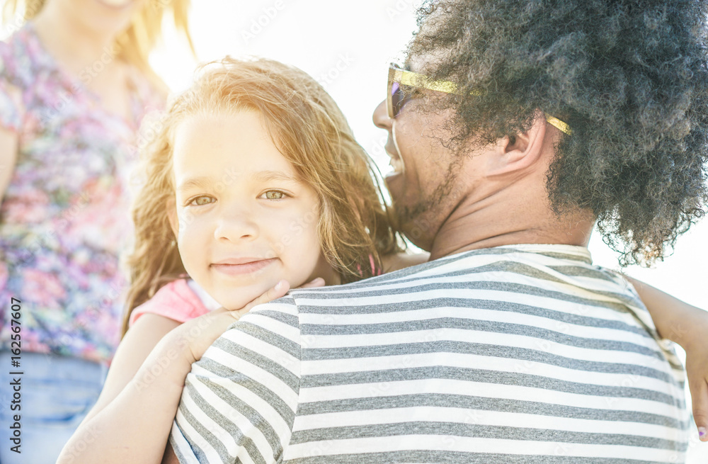 Happy multi ethnic family having fun on the beach - Diverse culture couple playing with daughter on summer vacation - Travel,love,holidays concept - Soft focus on child eye, mouth , nose - Warm filter