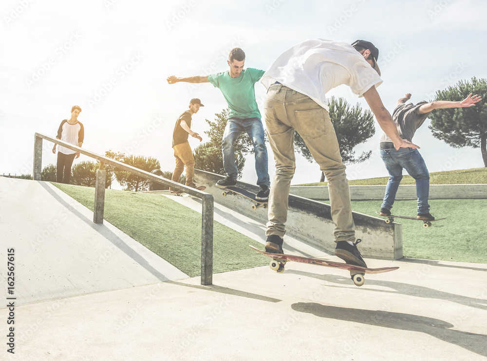 Group of skaters friends performing trick and skills in urban contest - Young men training with boards in skate park at sunset - Extreme sport concept - Focus on left guys - Vintage contrast filter