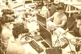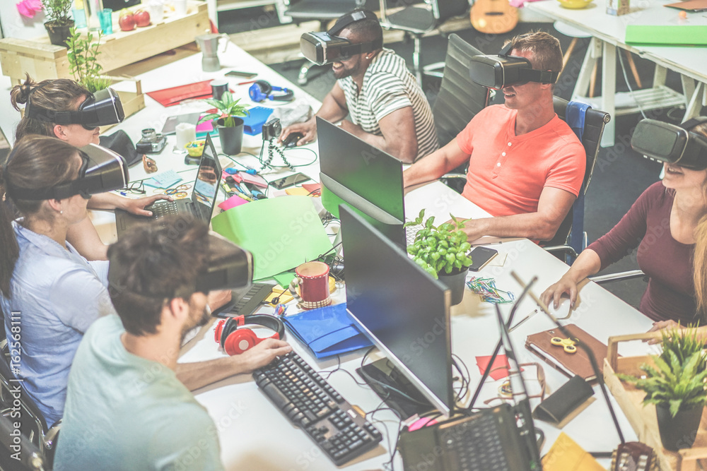 Young teamwork using virtual reality glasses in creative office - Business casually dressed people at work - Focus on right white man on his headset - New technology trends concept - Retro filter