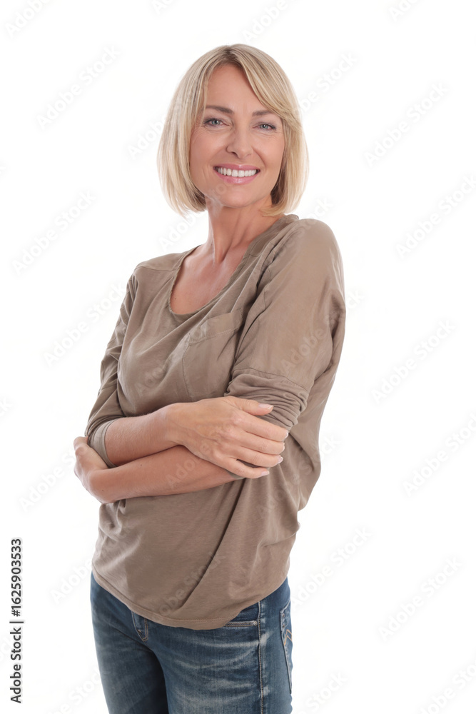 Smiling woman in casual brown shirt with arms crossed, isolated on white background