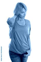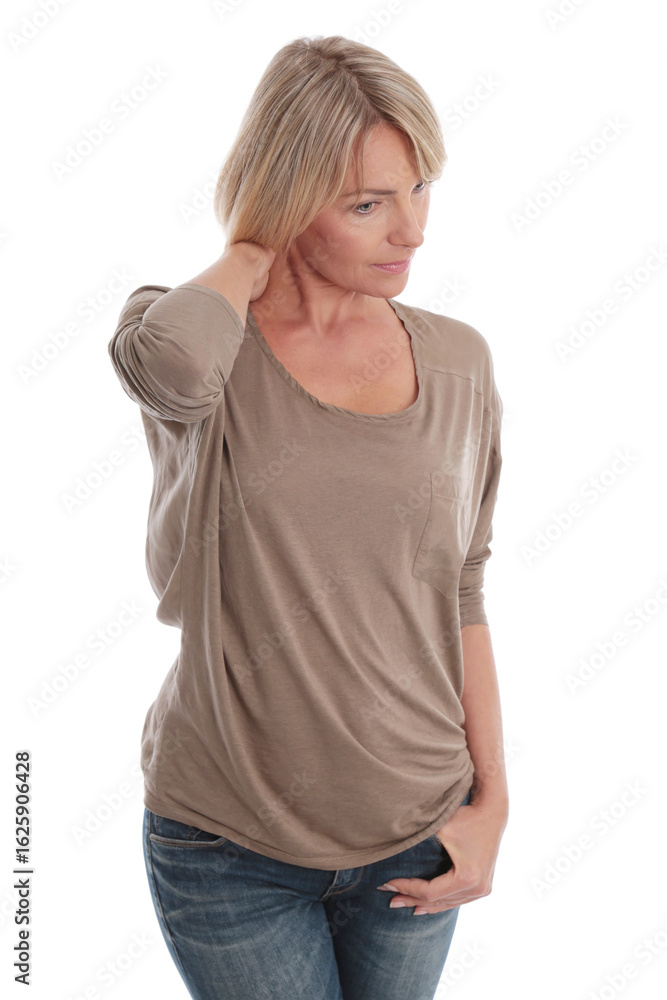 Thoughtful woman in casual brown shirt and jeans posing with hand on neck, isolated on white background