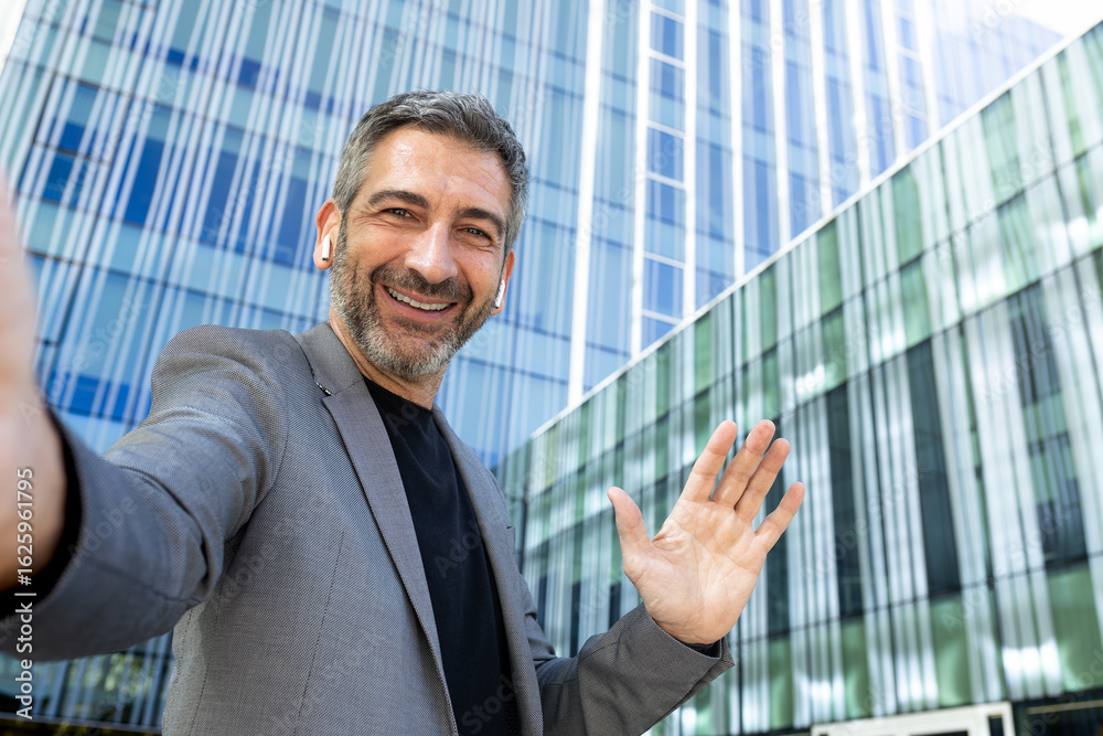 Selfie of happy mature man in the city near office buildings looking at camera waving hand.Copy space.