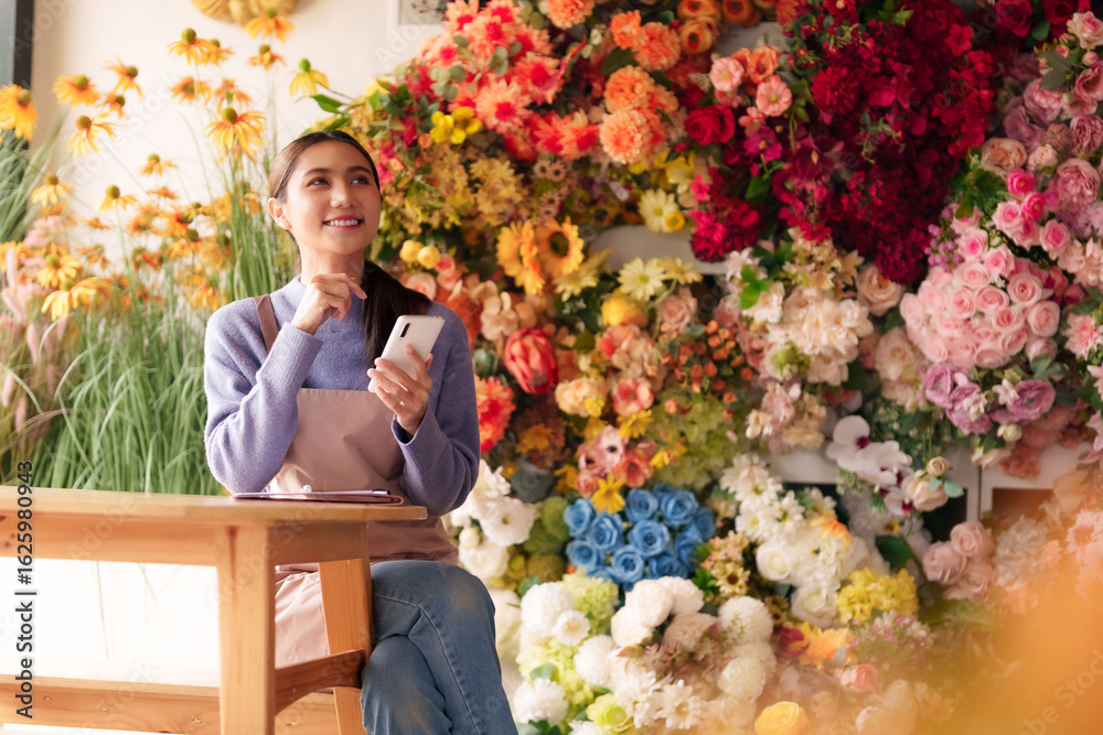 Asian adult woman florist manages flower shop uses phone for business operations thoughtfully planning floral designs customer orders vibrant colorful flower retail store for small business growth