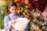 Asian adult woman florist carefully arranging beautiful pink roses bouquet vibrant flower shop preparing customer orders