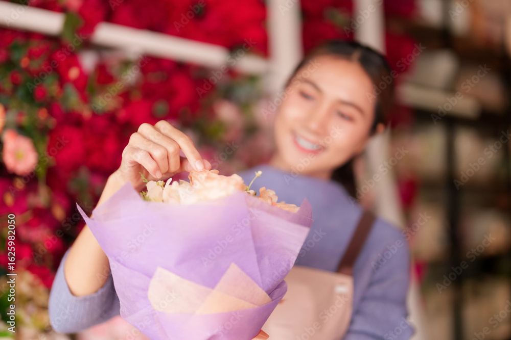 Asian adult woman florist arranging beautiful fresh flower bouquet at vibrant retail shop delivering excellent customer service