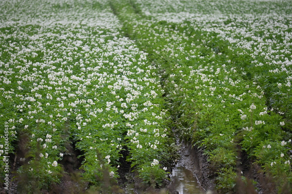The field of flowering potatoes during summer.White Flowers of a farmer field Grown Organic Potato Plant