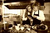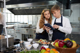young chef cooking some food and checking recipe on tablet in the kitchen