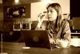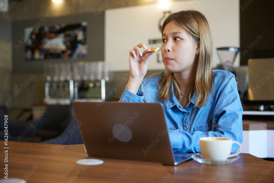 young woman working on laptop computer, eating cookies and drinking a coffee in the cafe