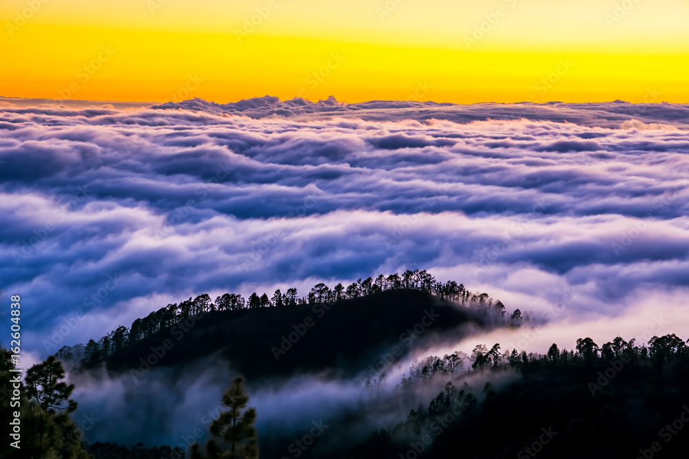 Amazing view of mountain peaks with beautiful clouds on the sunset. Location: Tenerife, Canary Islands, Spain. Artistic picture. Beauty world.